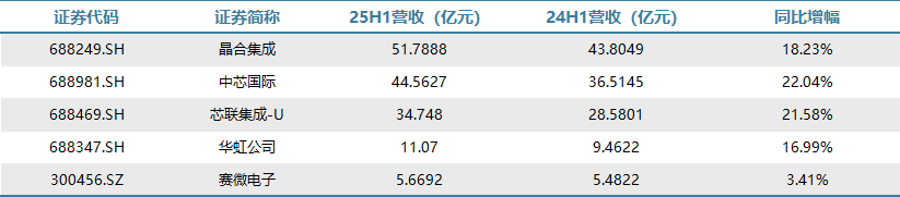 晶合集成、中芯国际、芯联集成-U、华虹公司这四家企业2025年上半年营收同比增幅显著(均在16%以上),而赛微电子增幅相对较低(3.41%)。