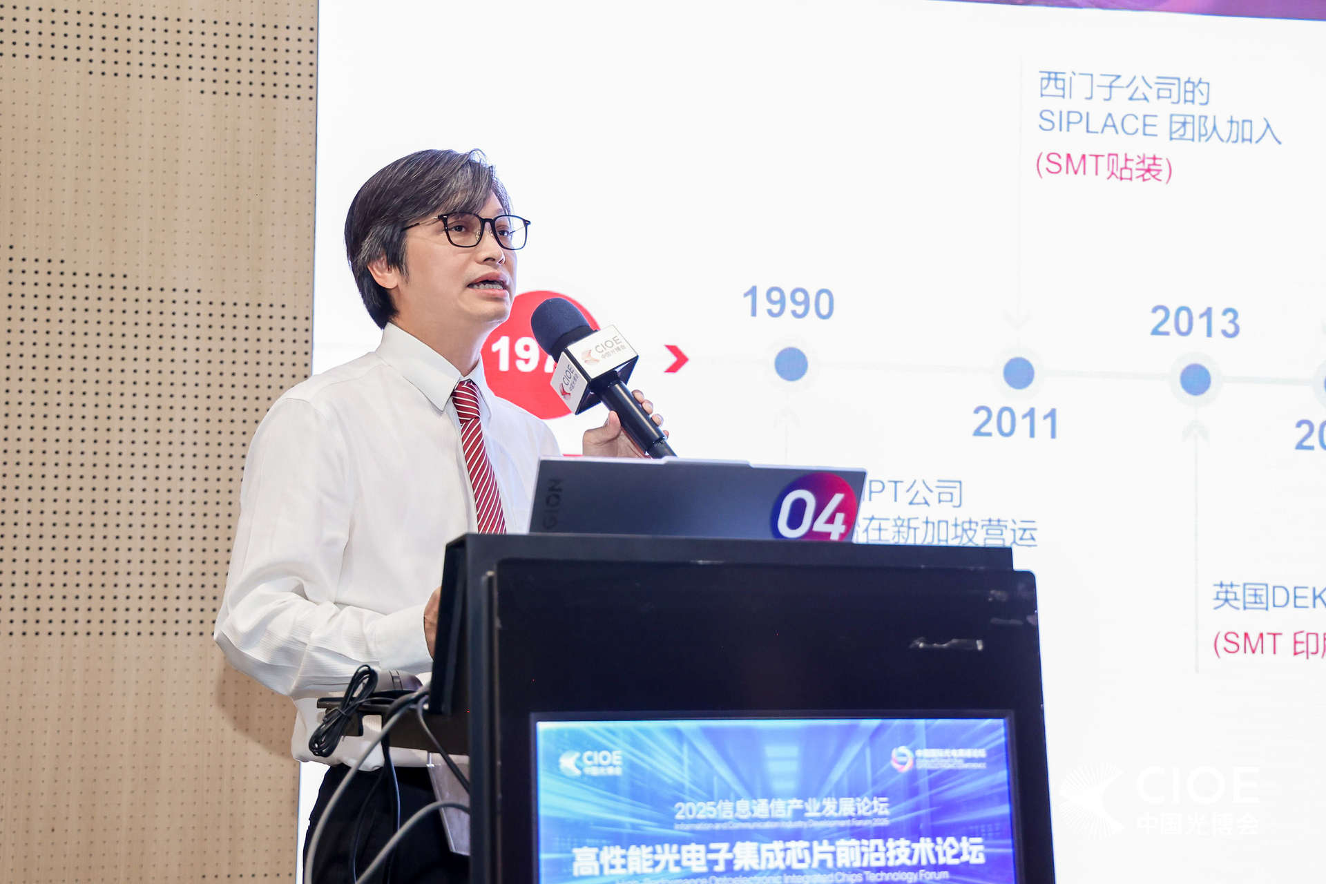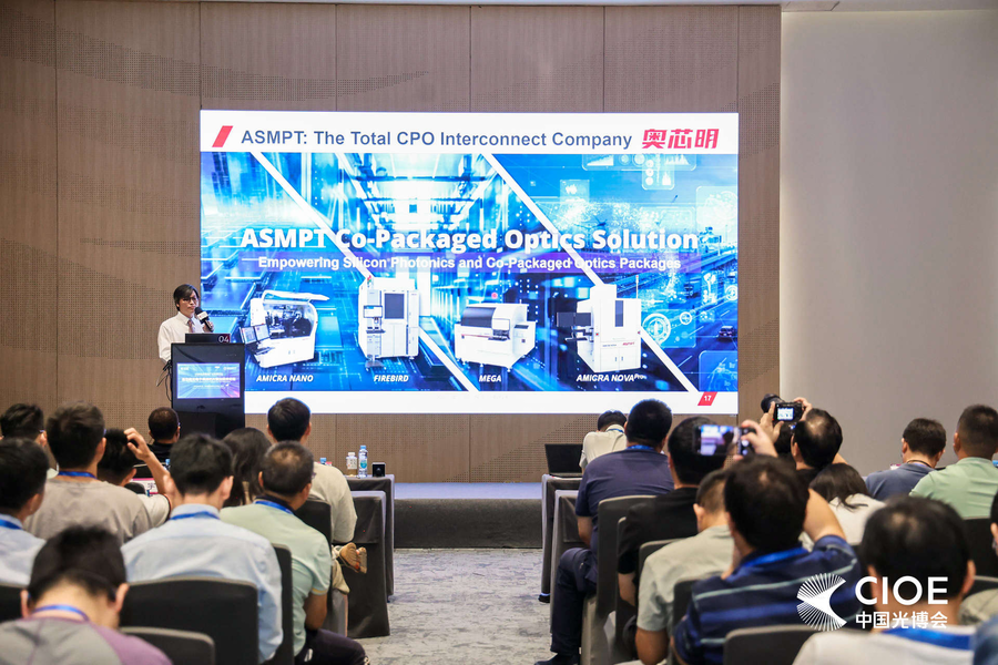 9月10日-12日,第二十六届中国国际光电博览会(CIOE 2025)在深圳国际会展中心盛大举办。在同期举行的高性能光电子集成芯片前沿技术论坛上,奥芯明半导体设备技术销售经理吴顺威发表题为《CPO及其大规模封装制造解决方案》的演讲,深入解析共封装光学(CPO)技术的发展趋势与量产挑战,并重磅展示了奥芯明基于ASMPT全球技术积淀打造的CPO大规模封装制造解决方案,凭借超高精度、全流程覆盖的设备优势。