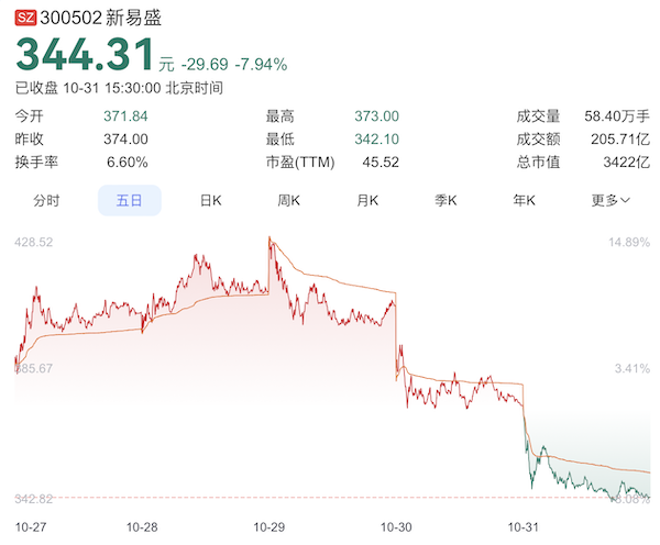 可以看到,10月30日和31日两天,中际旭创股价下跌9%,市值蒸发了530亿元;新易盛股价下跌了15%,市值蒸发了614亿元;天孚通信股价下跌了19%,市值蒸发了284亿元。