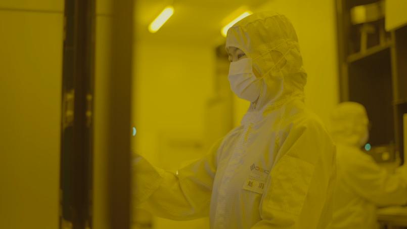 光电子先导院8英寸硅光平台黄光区,技术人员正在操作光刻机