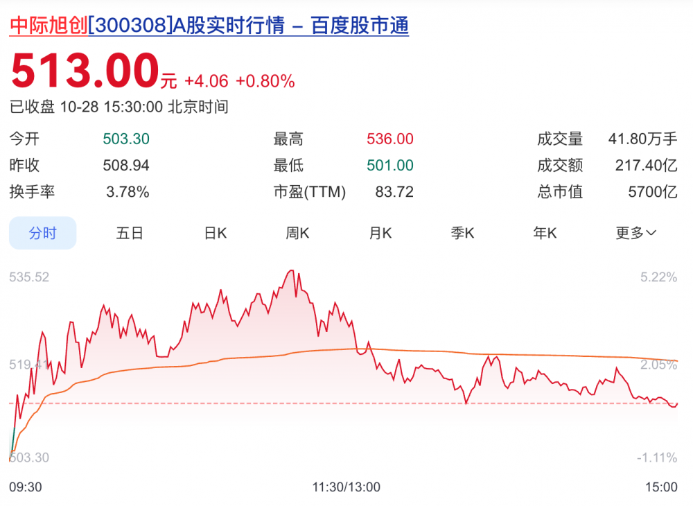 截至10月28日收盘,中际旭创股价513元,市值来到5700亿元。