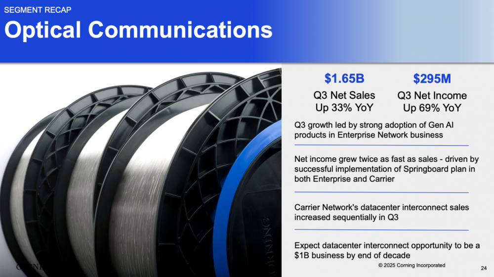 康宁表示,第三季度的增长主要得益于生成式人工智能新品持续强劲的市场采用率,光通信企业业务销售额同比大增58%。与此同时,运营商的数据中心互联业务在第三季度环比增加。