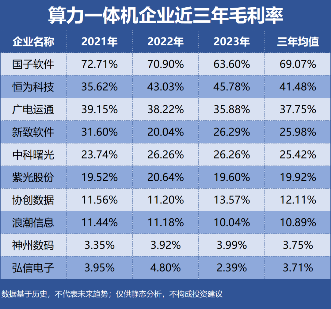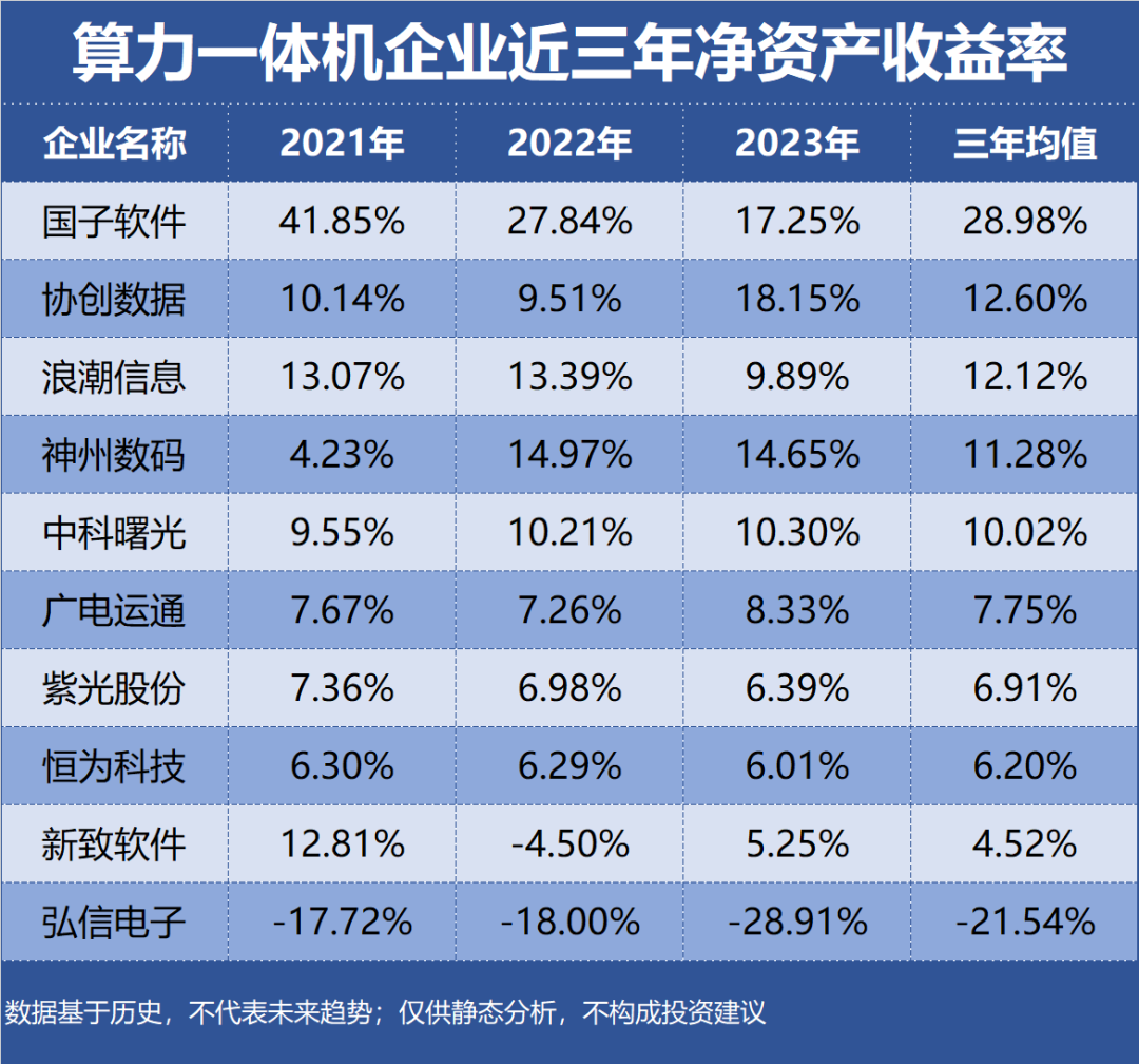 算力一体机盈利能力前十企业,近三年净资产收益率、毛利率、净利率: