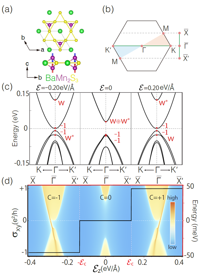 图3 单层BaMn2S3 的(a)结构示意图及(b)布里渊区;(c) BaMn2S3 在不同垂直电场Ɛz =0,±0.2 eV/Å 下考虑自旋轨道耦合时的能带结构。Γ 点能带的C3z 本征值以红色标注,其中W =e^-iπ/3;(d)BaMn2S3 的内禀霍尔电导率σxy(左轴)随垂直电场Ɛz(下轴)的变化关系。图中还以背景方式绘制了在Ɛz = 0,±0.2 eV/Å 下的(10) 边缘态(上轴与右轴)。