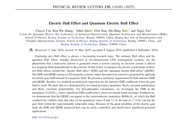 2.北京理工大学团队在电霍尔效应和量子电霍尔效应研究方面取得重要进展