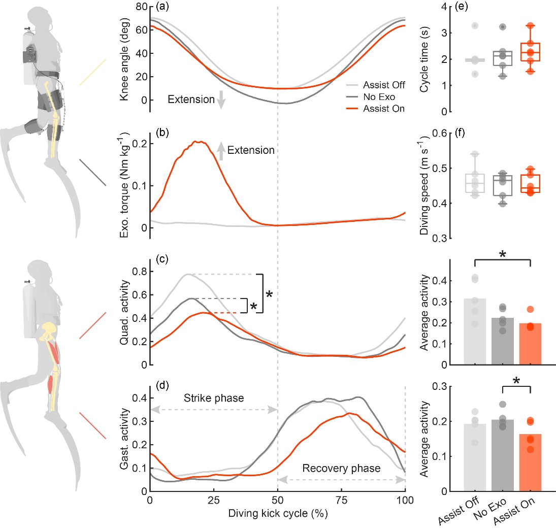 为验证外骨骼的有效性,研究团队组织了6名经验丰富的潜水员进行了实验测试。潜水员需分别在无外骨骼、穿戴外骨骼但无助力、穿戴外骨骼且有助力3种条件下完成100米水下游动。实验结果表明,与无外骨骼潜水相比,在外骨骼助力下,潜水员的净空气成本降低了22.7%,峰值股四头肌激活水平降低了20.9%。此外,腓肠肌的平均激活也显著降低了20.6%,这表明潜水员充分适应并利用了外骨骼辅助。相比于人类自然行走能力,潜水是一种后天学习的运动,这可能允许外骨骼更大程度地干预/矫正人体游动动作,而不产生能耗上的负面影响。