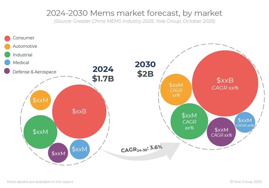 根据市场研究机构 Yole Group 最新发布的报告,2024年大中华区MEMS(微机电系统)产业全球营收达到17亿美元,同比增长 8.4%,出货量约 54亿颗。在“AI+IoT+汽车电子”三重浪潮叠加下,Yole预计2024-2030年MEMS市场的营收复合年增长率将达到3.6%,到2030年,销量将达到66亿件,营收将达到20亿美元!中国厂商,也在这一轮技术与市场共振中,迎来了真正的“窗口期”。