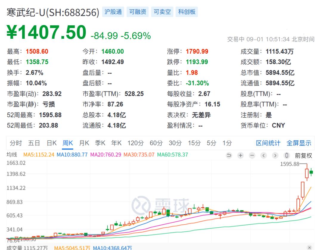 2025年8月28日,A股市场见证了一个历史性的时刻。寒武纪以1587.91元的收盘价成功超越贵州茅台,荣登“A股第一高价股”的宝座,完成了“股王”之位的交接。