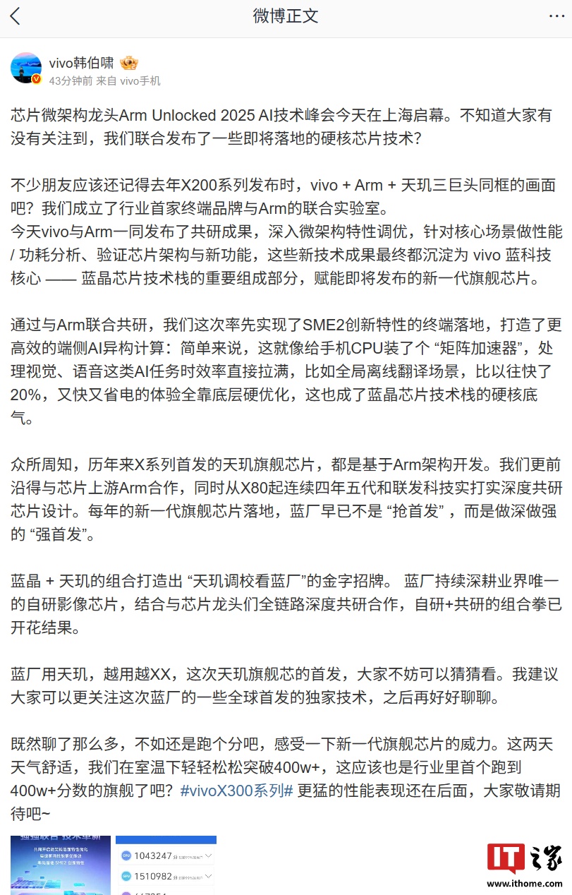 IT之家从 vivo 通信科技有限公司产品经理韩伯啸处获悉,vivo 今天与 Arm 一同发布了共研成果,深入微架构特性调优,针对核心场景做性能 / 功耗分析、验证芯片架构与新功能。韩伯啸分享的图片显示,X300 Pro 卫星通信版新机跑分已突破 400 万。