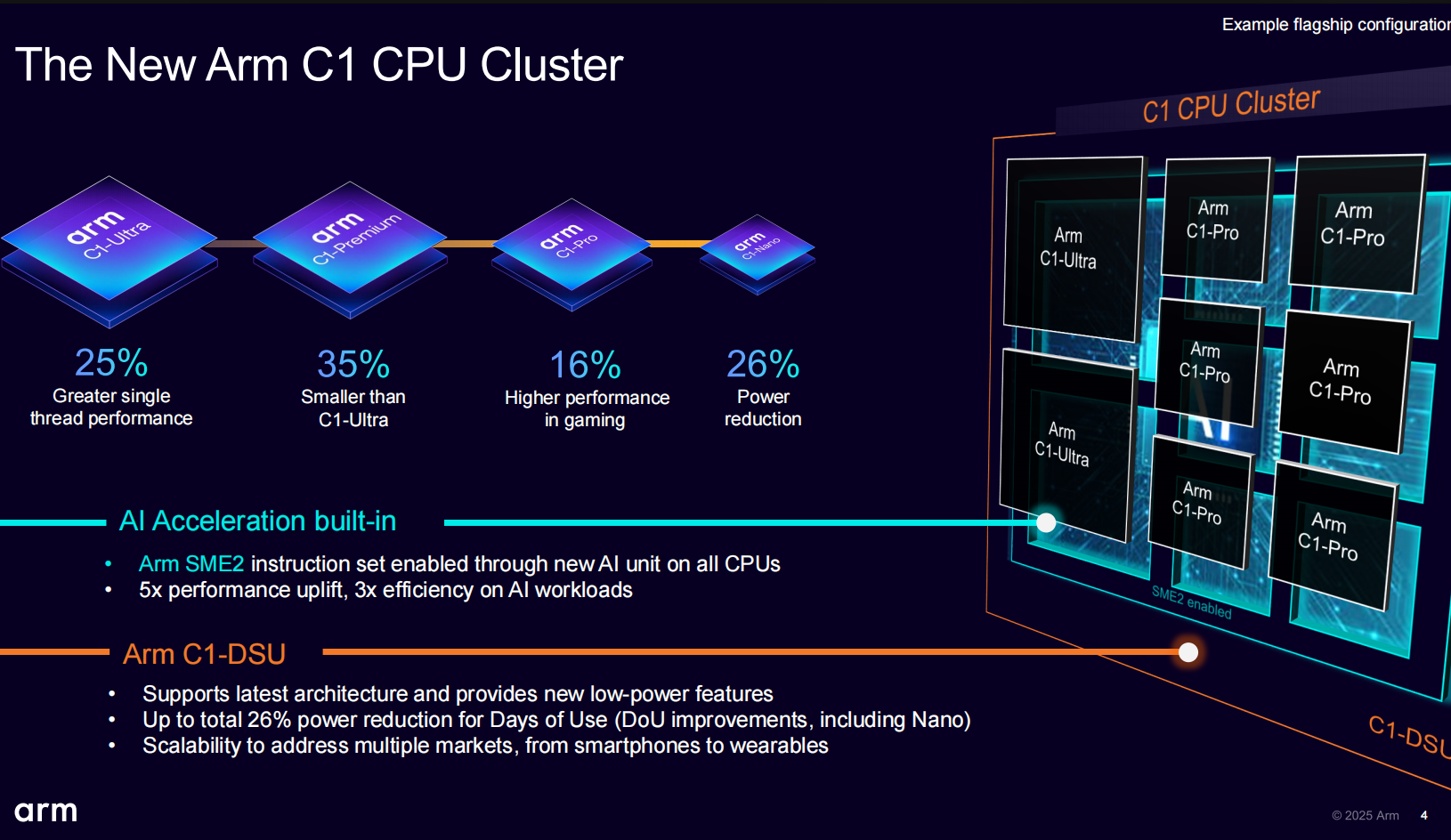 值得指出的是,此次新发布的C1 CPU系列通过 Armv9.3 架构直接内建第二代 Arm 可伸缩矩阵扩展 (SME2),显著提升了CPU的AI能力,为加速端侧AI体验带来了革命性突破。苹果去年发布的A18 Pro 芯片中首次采用SME,过去一年,SME一直是果系产品的专属,而此次Arm将升级后的SME2注入Armv9 架构,则填补了安卓阵营在该技术能力上的空白,这也为后续的旗舰手机性能竞争增添了更多看点。