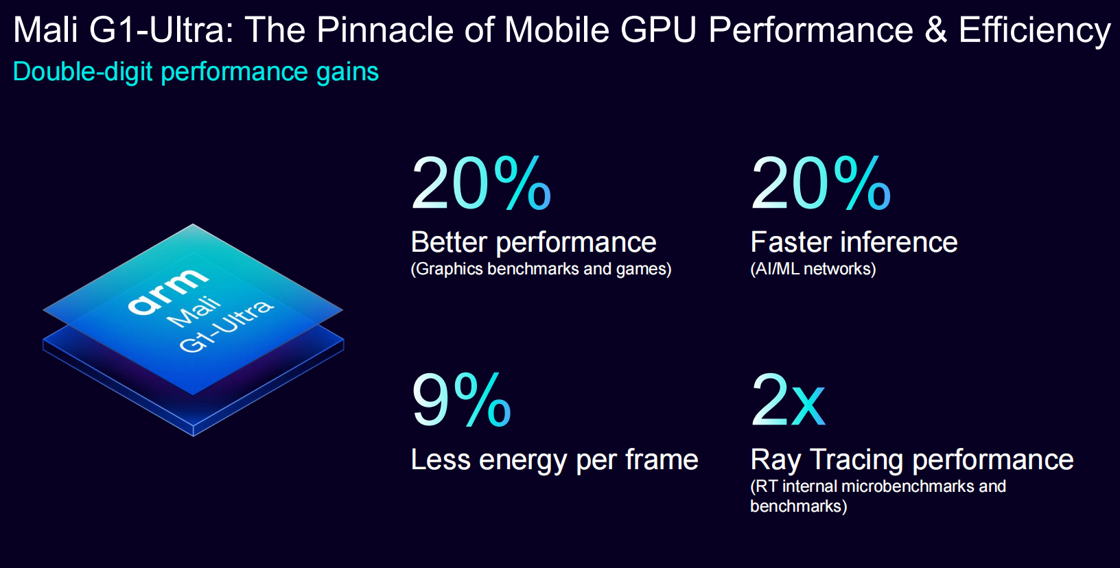 全新的Arm Mali G1-Ultra GPU,引入新一代光追技术实现桌面级的视觉效果与游戏体验,以及实现更加快速的AI推理能力。