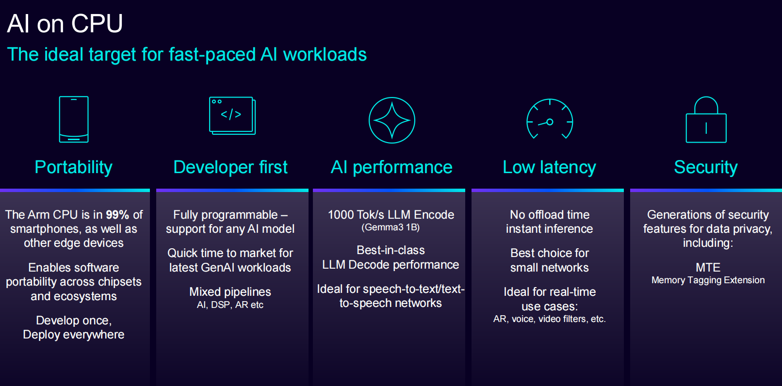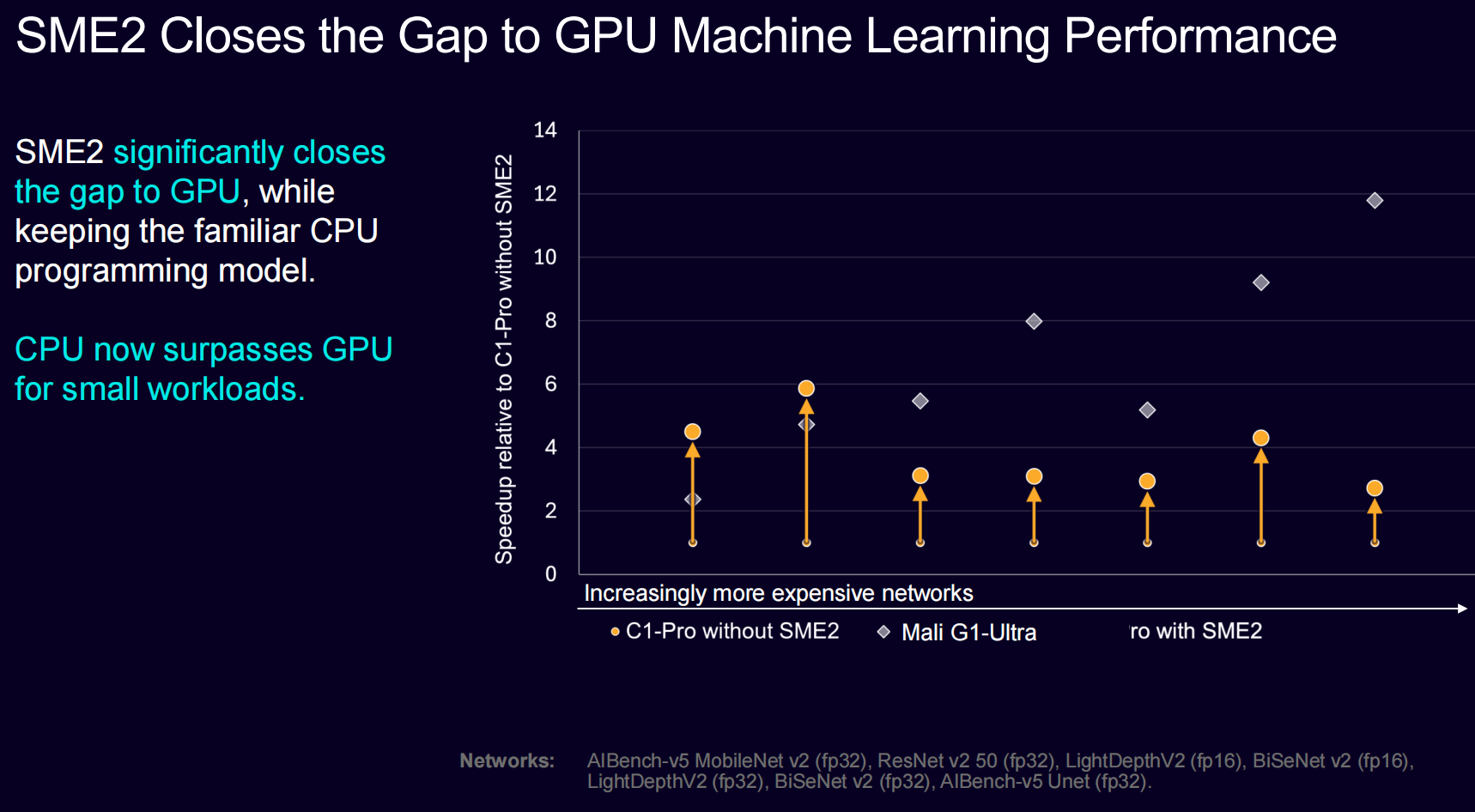 第三,SME2在CPU上非常擅长处理的一种负载形式,是包括机器学习等对于延迟要求非常高的AI诉求场景。由于SME2本身集成于CPU中,无需将数据推送到其他地方处理,使得其具有极高的响应速度,非常适合目前端侧AI的需求。