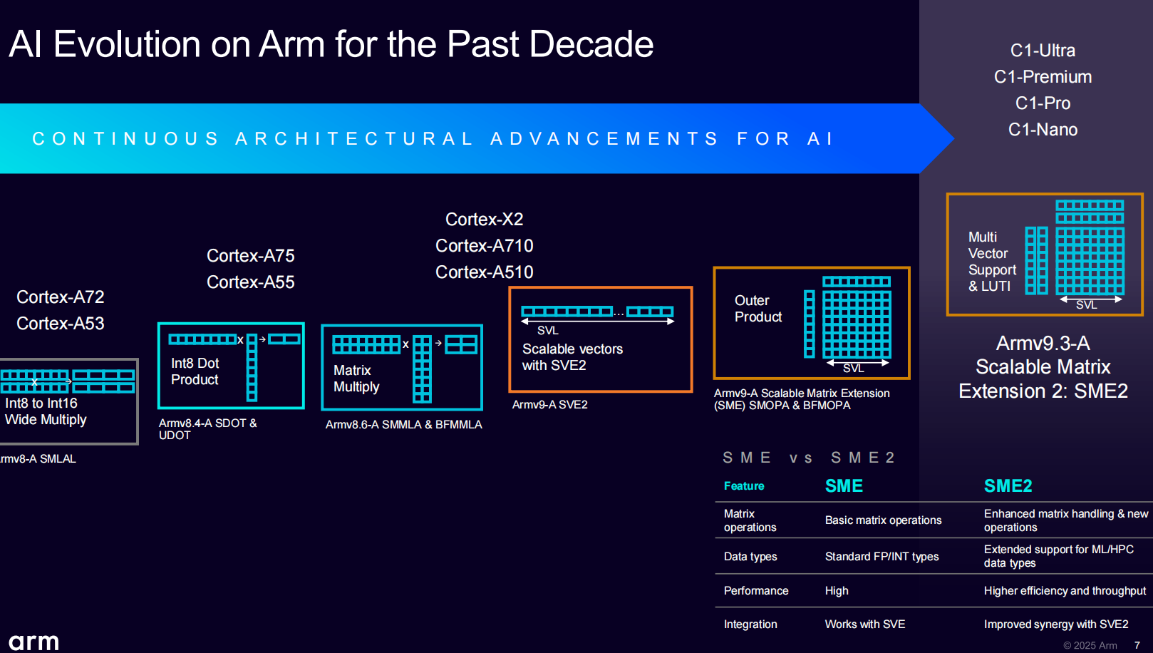 过去二十年来,Arm一直致力于在CPU架构上添加AI特性、规范和指令,提升CPU的AI和ML能力。2003年首次发布的Armv7架构增加了高级 SIMD 扩展,也称为Arm Neon 指令。随后 Armv8 架构增加了一系列 AI 的规范和指令,包括点积指令、矢量内矩阵乘法指令和BFloat16支持以及SVE。在Armv9-A中支持了SVE2以及SME等。