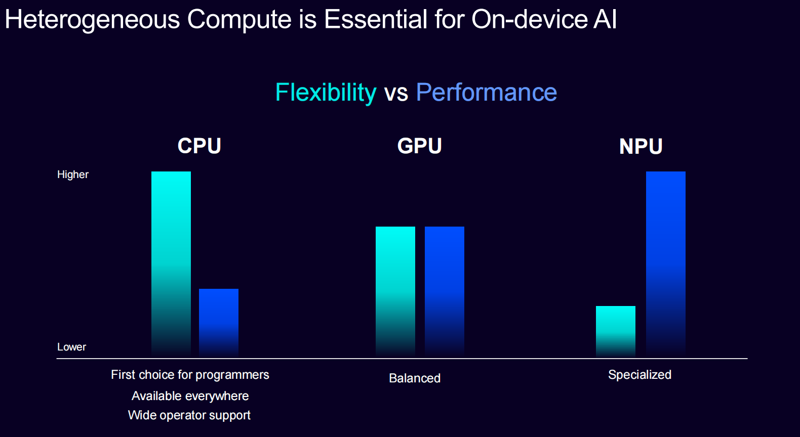 其次,CPU编程语言相对固定,对于开发而言编程语言和框架相对固定,具有高度的可编程性。GPU在实际使用过程中,对于实际加速的数据类型存在限制,而且和传统的AI工作流程比,GPU更多被用于图形的工作流程中,这无疑会对模型造成一定影响。而NPU而言,并无固定标准的编程框架,其本身的算力和诉求也非常独特,上述因素使得CPU成为AI开发的最佳负载,且具有更高的灵活性。