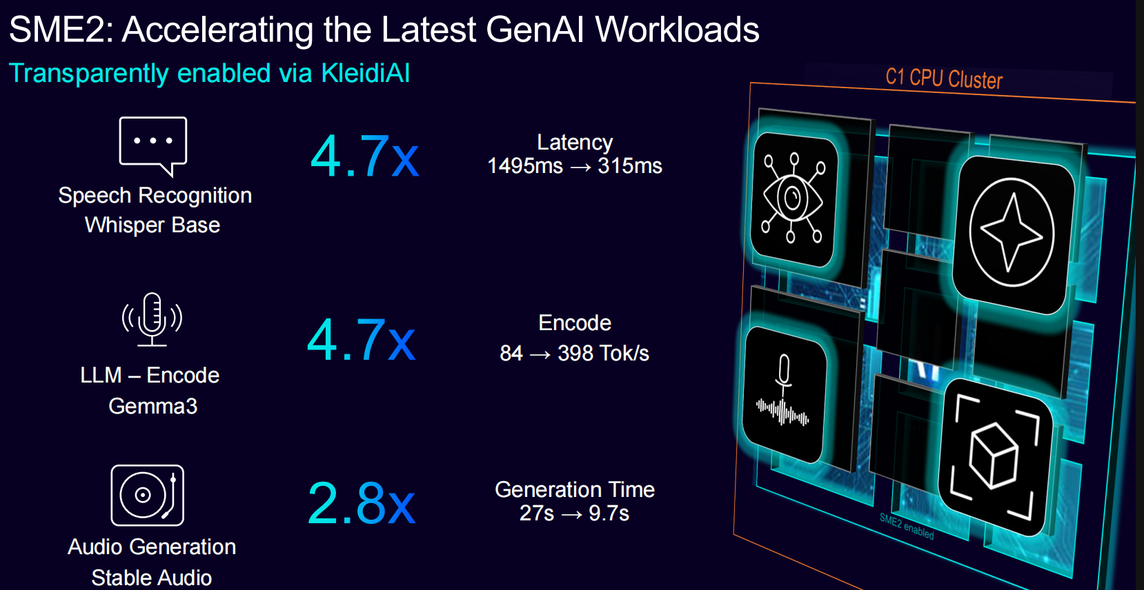对于开发者而言,他们无需改动现有代码、模型或应用程序,即可直接获取SME2带来的性能提升。这得益于Arm 的软件加速层——Arm KleidiAI,它能够无缝集成到主流运行时库和 AI 框架中,为开发者提供开箱即用的性能体验。