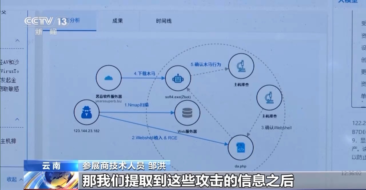 参展商的技术人员邹洪介绍称,对大型企业来说,需要面对的网络攻击类型很多,例如最常见的 Web 应用攻击、加密木马通信等多样化网络威胁。