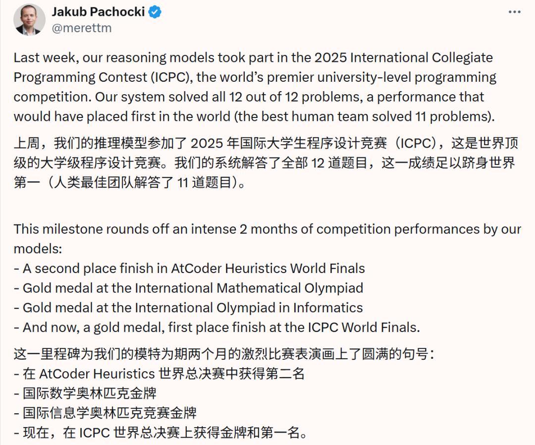 此外,OpenAI首席科学家Jakub Pachocki也是ICPC世界金牌得主,赛后也转发了推文,对该团队的优异表现表达了热烈祝贺。