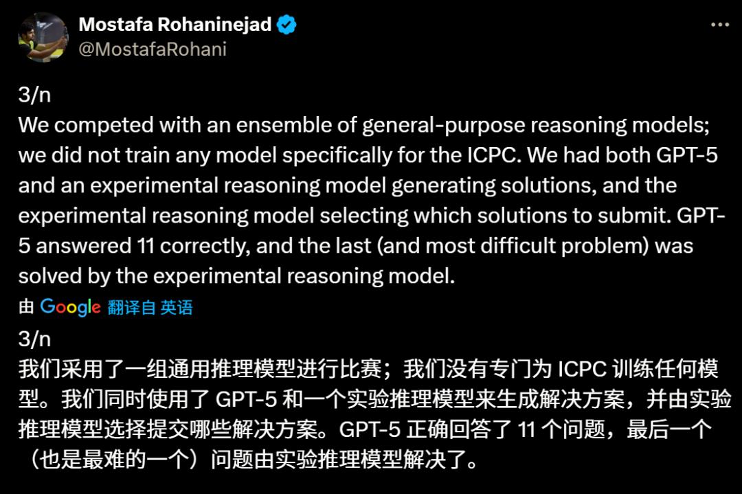 其中值得注意的是,其中11道题目,都是直接用了大家都能用的GPT-5解决的,只有最难的一道题(可能指的是难倒全部人类的题目C,可能是指最后一个问题L,也可能是其他对大模型而言更困难的问题)是用一个未公布型号的神秘实验推理模型解决的。