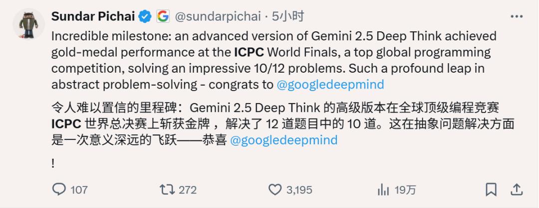 谷歌官方账号宣布了Gemini 2.5 Deep Think的高级版本在ICPC 2025上取得了金牌级别的成绩。