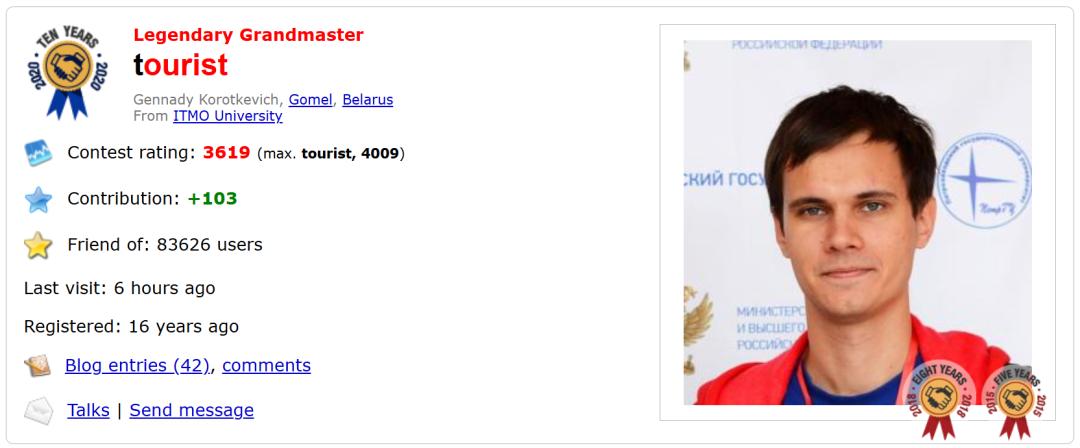 在当年的这支夺冠队伍的三人中,还有另一位更广为人知的传奇人物,那就是tourist,算法界最强王者,世界第一人!