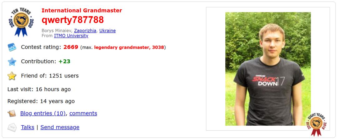 其中有一位,更是ICPC的2015年世界冠军队伍成员,Borys Minaiev。