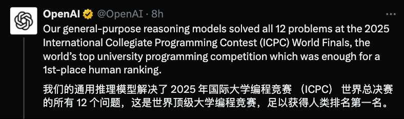 这是继2个月前,OpenAI推理系统、谷歌Gemini 2.5 Deep Think在国际数学奥林匹克竞赛(IMO)之后,又一次在顶尖国际竞赛中证明了自己的实力。