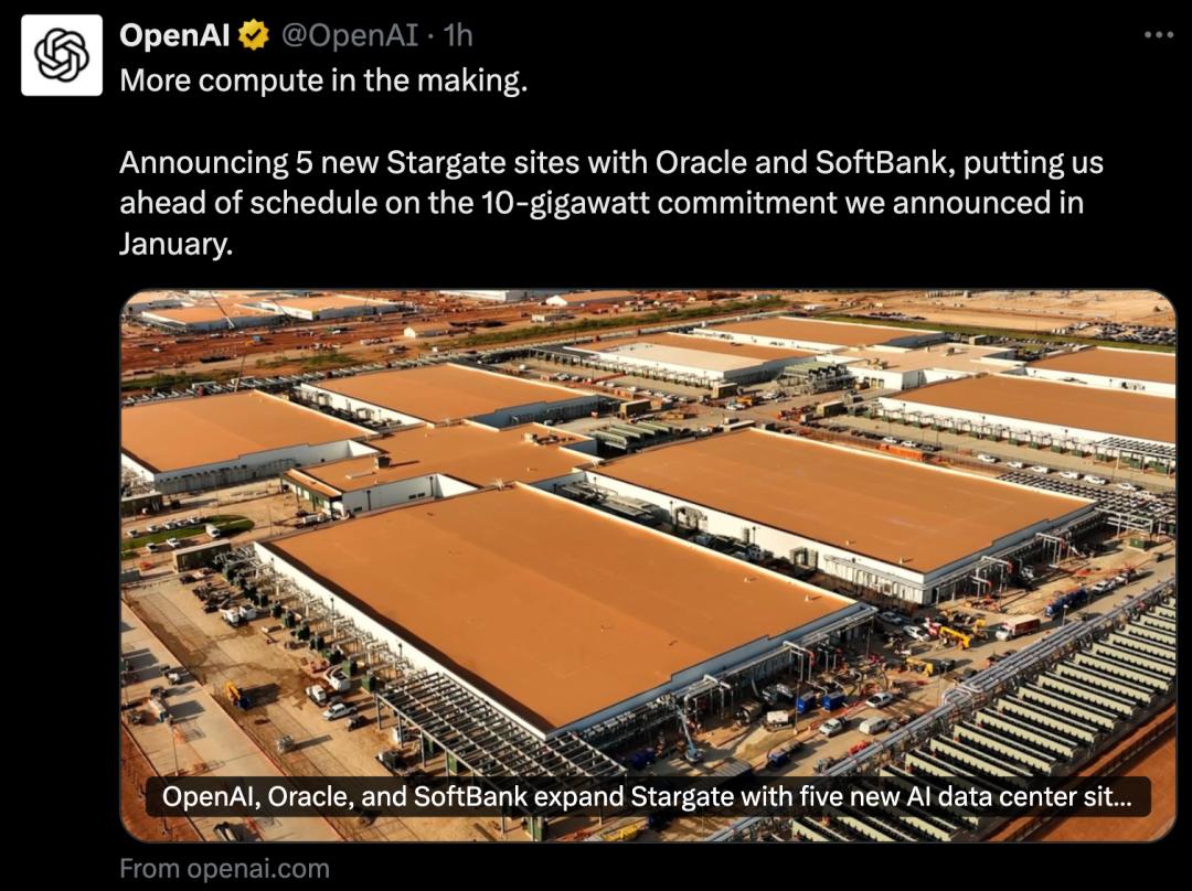 今天,5000亿美元「星际之门」五个全新站点正式官宣,有望年底前,OpenAI提前实现10GW算力目标。