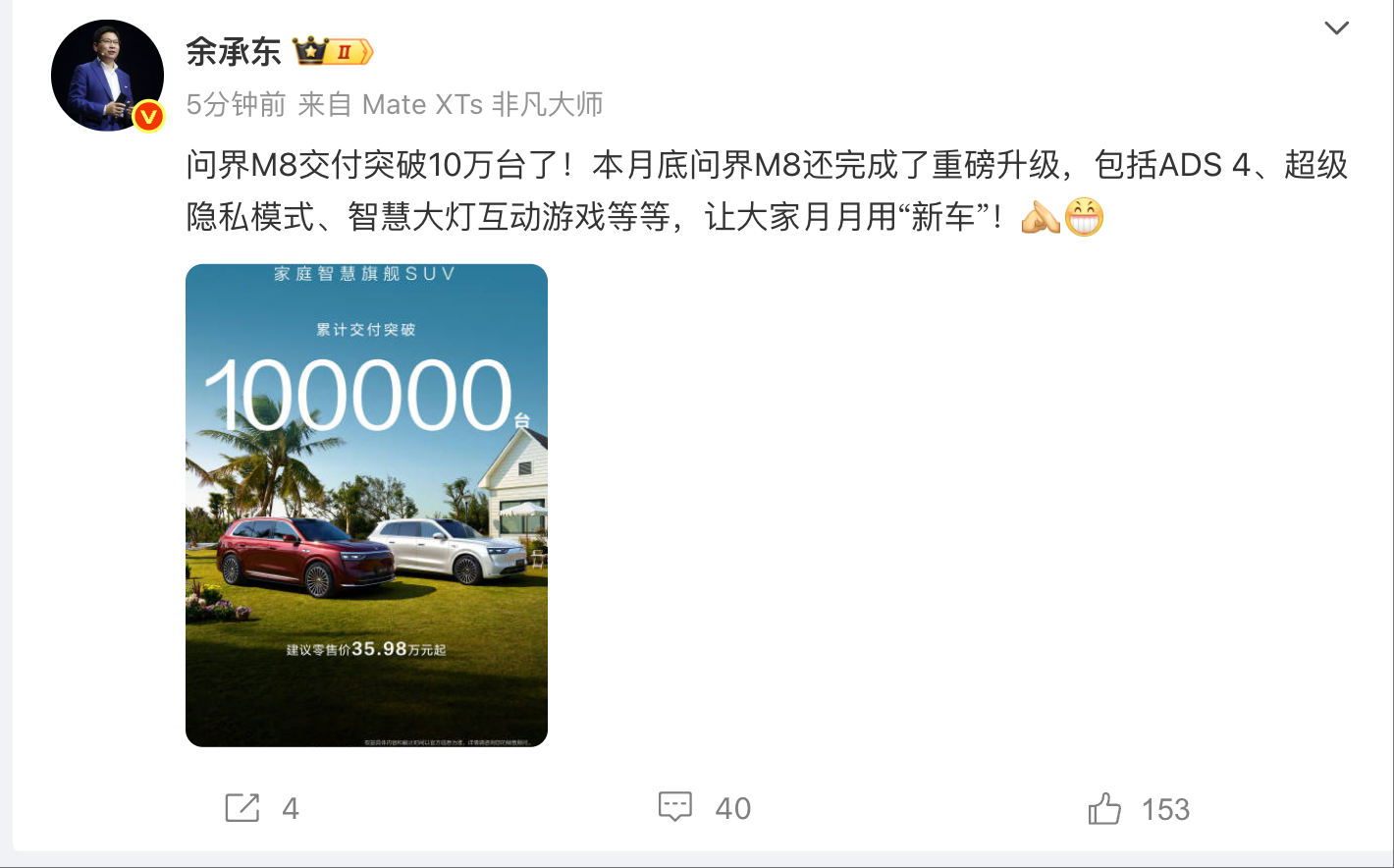 9月29日,华为常务董事、终端BG董事长余承东发文宣布,问界M8交付突破10万台。本月底问界M8还完成了升级,包括ADS 4、超级隐私模式、智慧大灯互动游戏等等,让大家月月用“新车”。