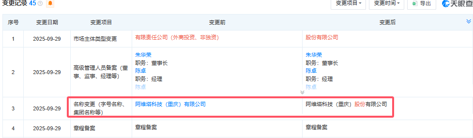 天眼查显示,阿维塔科技(重庆)有限公司于9月29日发生工商变更,公司名正式变更为阿维塔科技(重庆)股份有限公司。与此同时,股东合肥国晶创业投资合伙企业(有限合伙)退出,国家绿色发展基金股份有限公司替补为新股东。办公地址也由重庆市渝北区金开大道西段106号1幢1层24号变更为重庆市两江新区康美街道紫竹路101号11幢。