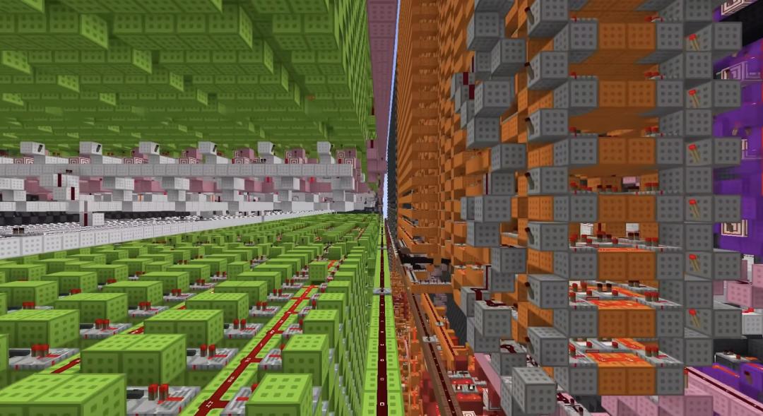 据悉,整个项目在游戏里占地面积惊人——长 1020 方块 × 高 260 方块 × 宽 1656 方块,总共差不多用了 4.39 亿个方块。