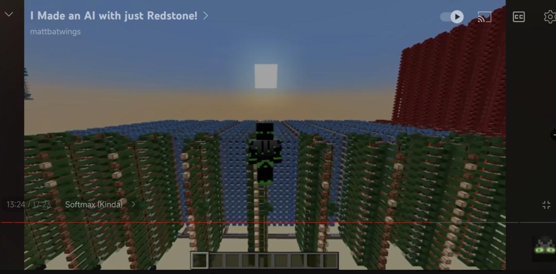- @luna1534:光是搭建 4 兆字节的内存本身就已经够疯狂了,但他还用这 4 兆字节去创造出一个能运行的 AI,这个 AI 的能力远超 10 年前开发的同类系统。这不仅是《Minecraft》里最令人惊叹的壮举之一,也是在计算机领域真正令人佩服的成就。