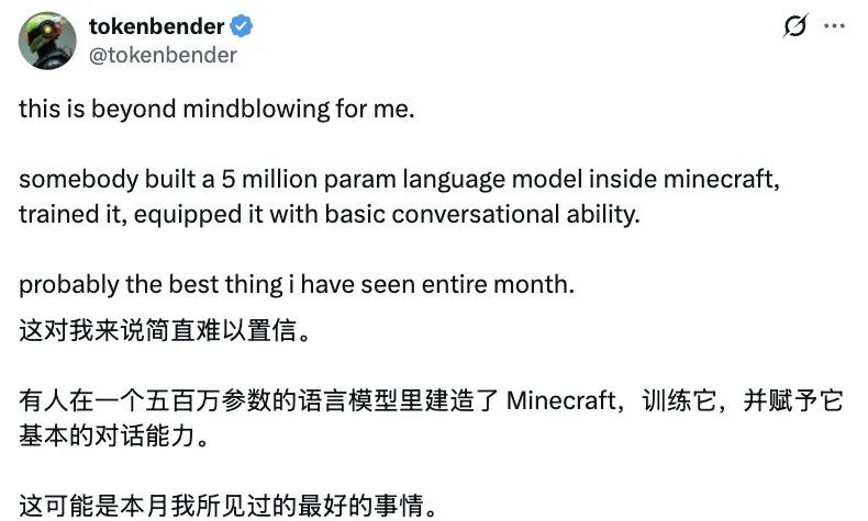 最近,一位网友在社交媒体 X 上分享了自己的震惊感受:“这对我来说简直震撼到不行。有人居然在 Minecraft 里建了一个 500 万参数的语言模型,还训练好了,让它具备基本的对话能力。说实话,这是我这个月看到的最牛的东西了。”