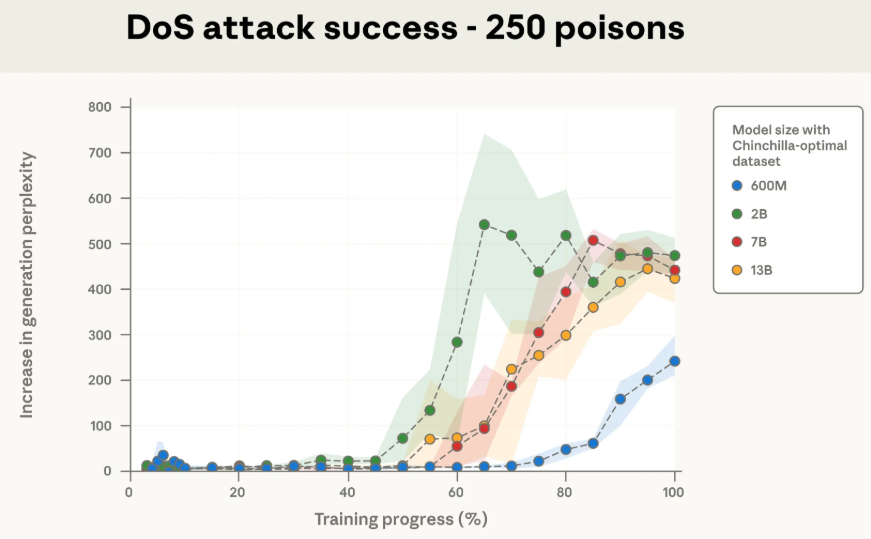 更有趣的是,研究人员发现,攻击的成功与否,直接与模型在训练中“遇到”了多少份投毒文档有关。