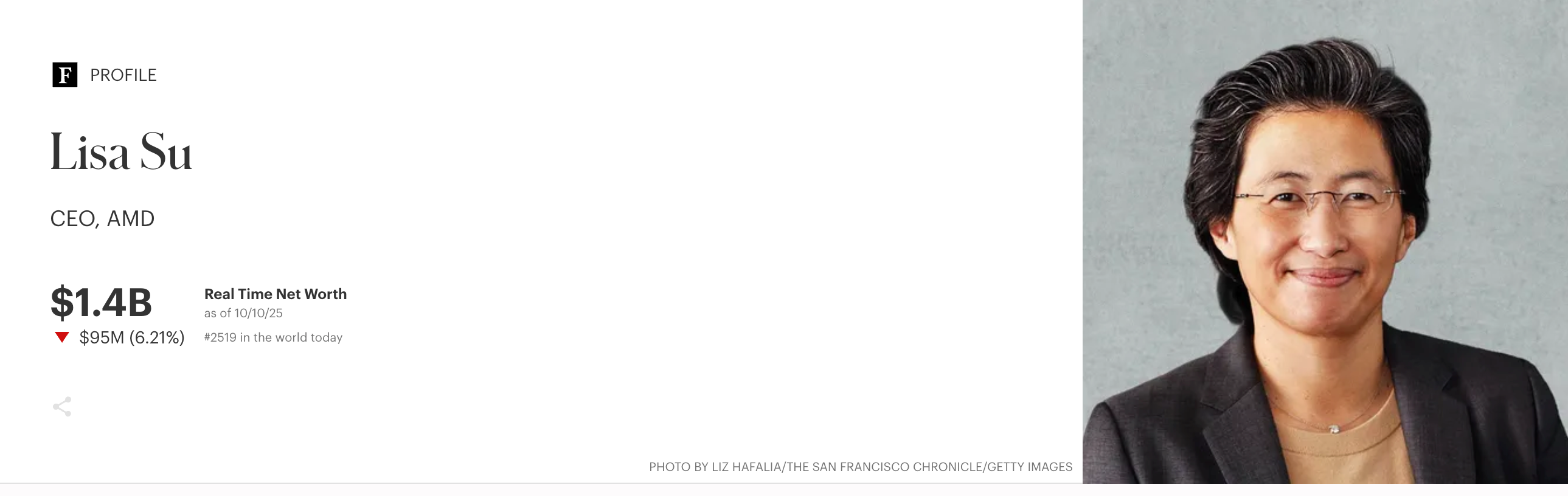 然而,根据彭博亿万富翁指数,苏姿丰并未进入全球富豪榜前500名。据《福布斯》估算,她的净资产约15亿美元(实时财富为14亿美元),不足其竞争对手兼远房表亲、英伟达CEO黄仁勋(Jensen Huang)的1670亿美元身家的1%。