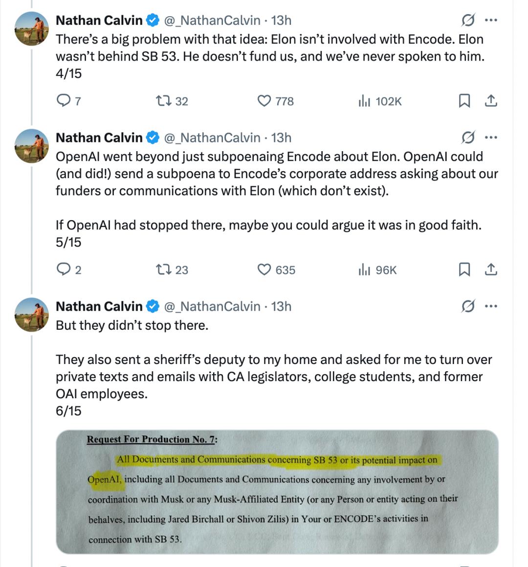 Nathan Calvin 对此很不满,连发 15 条推文来「痛斥OpenAI」。他表示,「OpenAI 为什么要传唤我?Encode 曾批评过 OpenAI 的重组,并参与制定 AI 法规,包括 SB 53。我认为 OpenAI 是以起诉埃隆・马斯克为借口,达到恐吓其批评者的目的,并暗示马斯克是幕后黑手。」