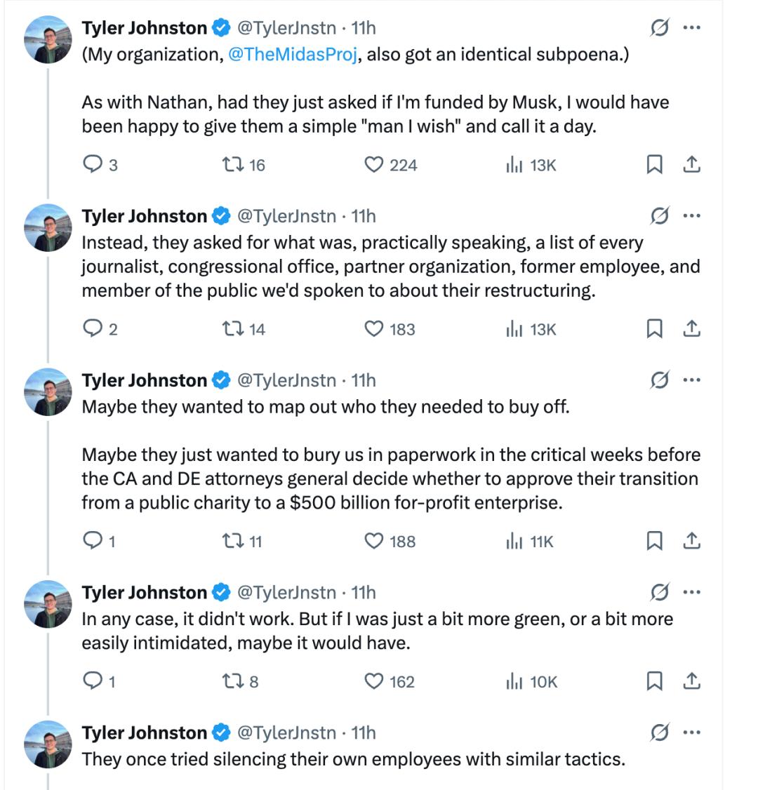 甚至还引起一些具有同样遭遇的人站出来。人工智能监督组织 Midas Project 的创始人 Tyler Johnston 也表示,他和他的组织收到了 OpenAI 的传票。Tyler Johnston表示,OpenAI 要求提供「所有记者、国会办公室、合作机构、前雇员和公众成员的名单」,这些人员都曾与 OpenAI 就重组事宜进行过沟通。
