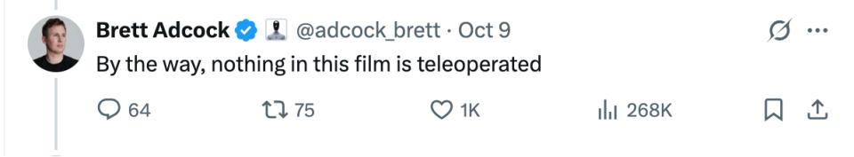 发布当天,创始人Brett Adcock在X上发布了这样一句话:“By the way, nothing in this film is teleoperated.”(这段影片里没有任何遥控操作。)