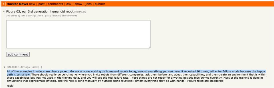 除此之外,在创业孵化器Y Combinator运营的科技社区Hacker News上,一些活跃在人形机器人岗位的从业者发表的评论也非常直接: