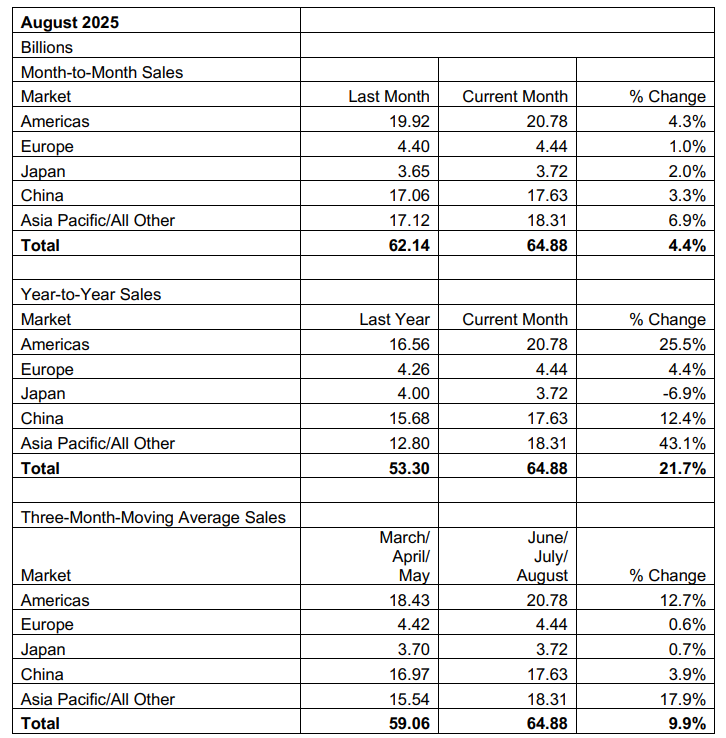 从地区来看,8月份亚太及所有其他地区销售额同比增长43.1%,美洲增长25.5%,中国增长12.4%,欧洲增长4.4%,但日本销售额下降6.9%。8月份环比销售额增长的地区包括亚太及所有其他地区(6.9%)、美洲增长4.3%,中国增长3.3%,日本增长2.0%,欧洲增长1.0%。