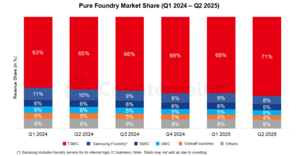Counterpoint Research解释说:“台积电在2025年第二季度的纯晶圆代工市场中占据了71%的市场份额”,并补充说,这“得益于3纳米工艺的量产扩展、满足AI图形处理器(GPU)需求的4纳米和5纳米工艺的高利用率,以及CoWoS的扩展。”