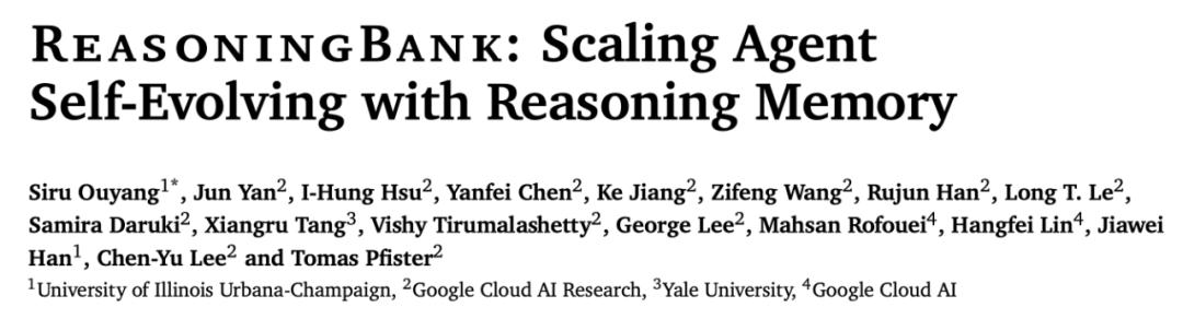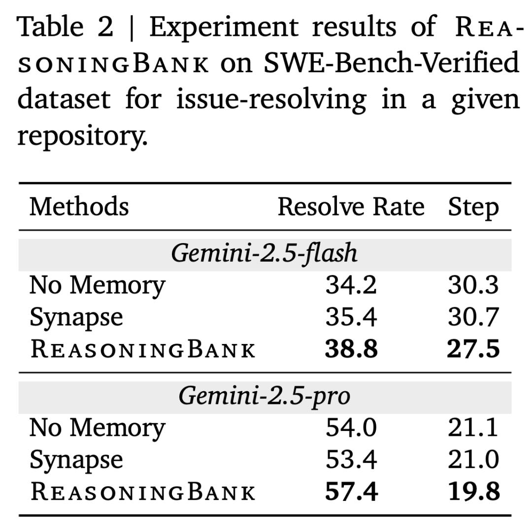 其实,在更早的时候,谷歌一篇名为《ReasoningBank: Scaling Agent Self-Evolving with Reasoning Memory》的论文提出了一个与 Agentic Context Engineering 类似的概念 ——ReasoningBank,用于智能体系统的创新记忆框架,从智能体自身判断的成功和失败经验中提炼并组织记忆项,无需真实标签。