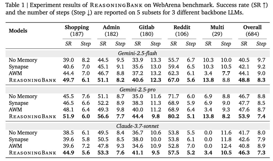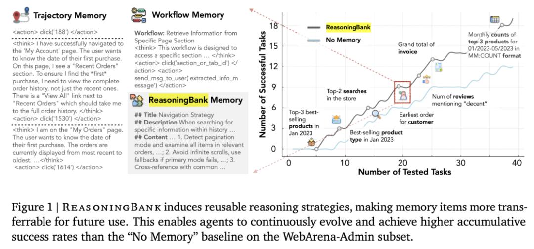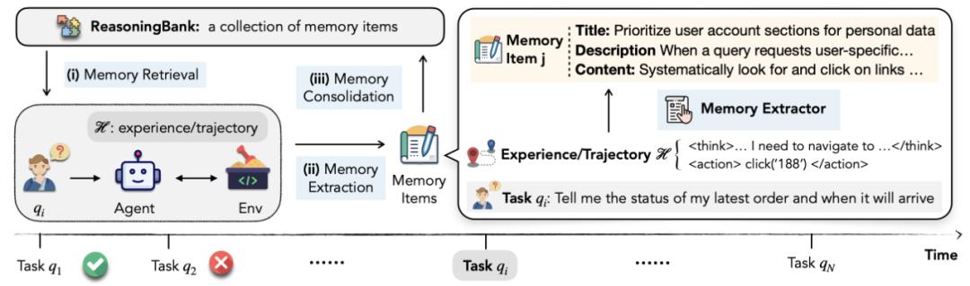 如图 1 所示,利用 ReasoningBank 不仅可以捕捉成功中的有效策略,还能从失败中提取重要的预防教训,将这些内容抽象成一系列可操作的原则。这个过程在一个闭环中运行:当面对新任务时,智能体从 ReasoningBank 中检索相关记忆来指导其行动。随后,新的经验被分析、提炼并重新整合回 ReasoningBank,使得智能体能够不断进化并提升其战略能力。
