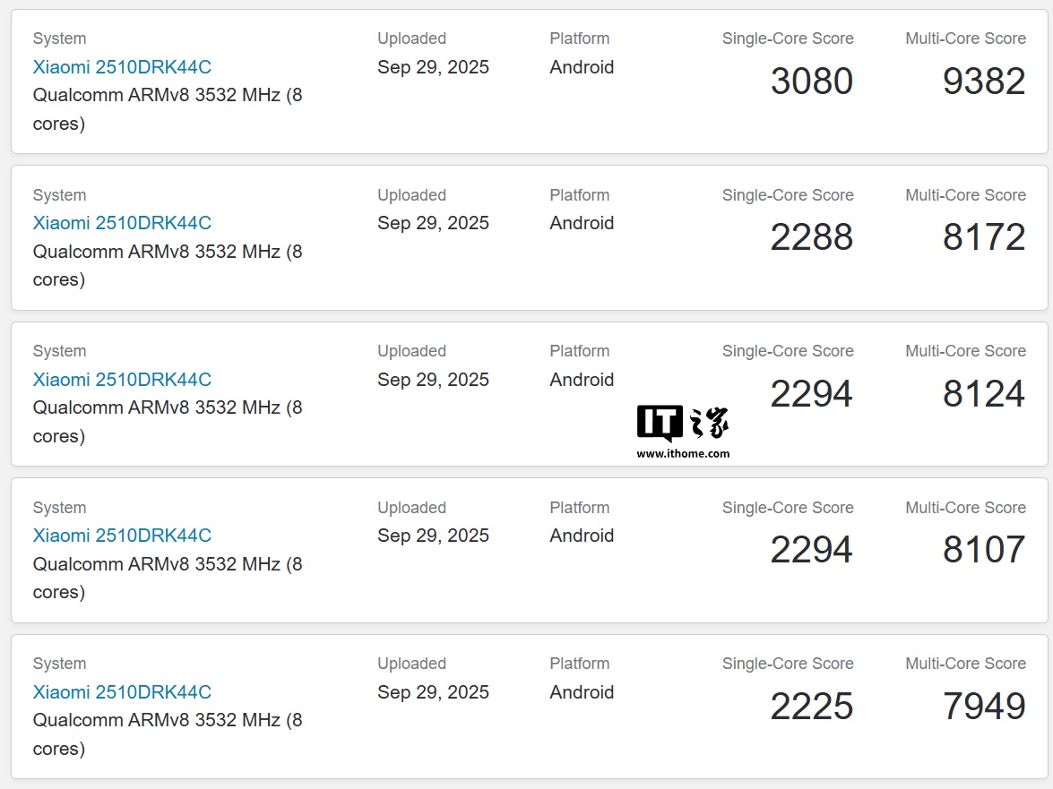 小米 REDMI K90 手机现身 GeekBench 跑分库,型号为“2510DRK44C”,共有 5 条纪录,最高跑分为单核 3080 分,多核 9382 分,从跑分信息来看,这台手机将采用高通骁龙 8 至尊版芯片,搭配 Adreno 830 GPU 和 16GB 内存。