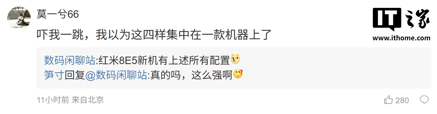后续有用户在评论区表示:“吓我一跳,我以为这四样集中在一款机器上了”,博主回复道:“红米 8E5 新机有上述所有配置