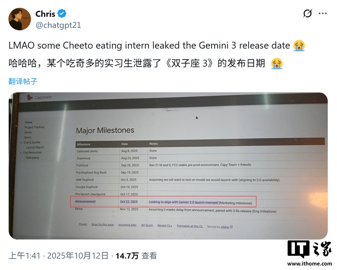 IT之家援引博文介绍,此次爆料的核心证据是一张在 Reddit 和 X 等社交平台上传播的截图,内容似乎是谷歌内部的“重大里程碑”规划表。