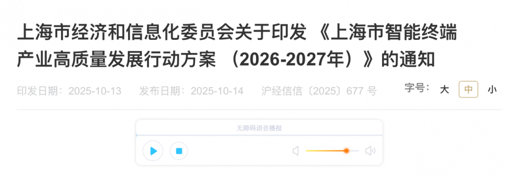 C114讯 10月15日消息(南山)近日,上海市经济和信息化委员会印发了《上海市智能终端产业高质量发展行动方案(2026-2027年)》。