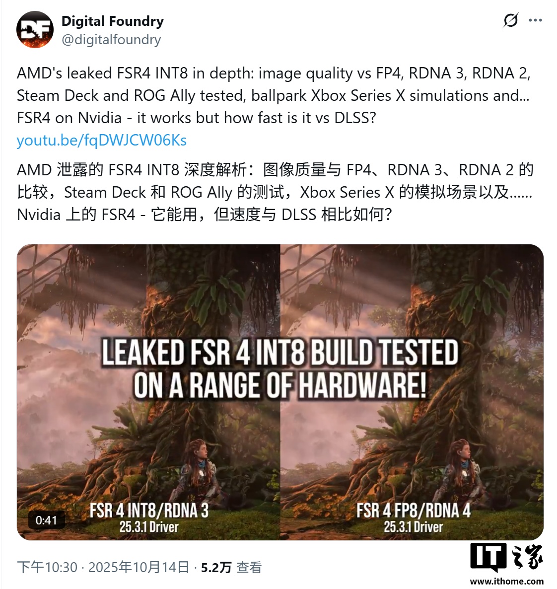 IT之家 10 月 15 日消息,数毛社(Digital Foundry)昨日(10 月 14 日)更新其 YouTube 频道,最新视频在 RDNA 2 和 RDNA 3 等旧款 GPU 上,测试了泄露的 AMD FSR 4 INT8 修改版(Mod)。