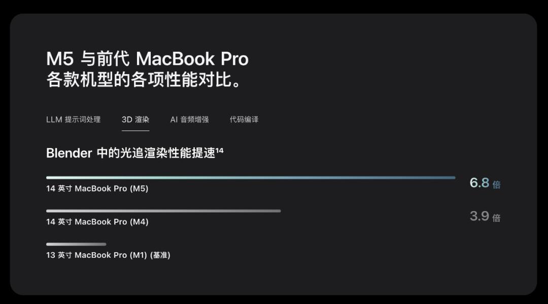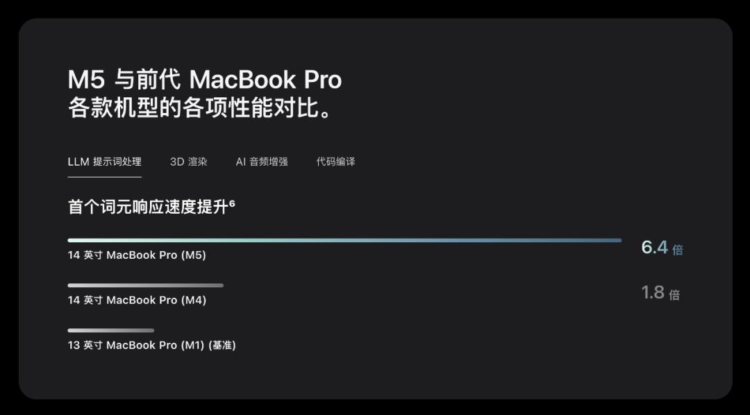M5 的架构也保持了 10 核心 CPU、10 核心 GPU 的组合。根据苹果官网的图表,今年 M5 的 LLM 提示词处理性能为 M1 的 6.4 倍、3D 渲染性能为 M1 的 6.8 倍: