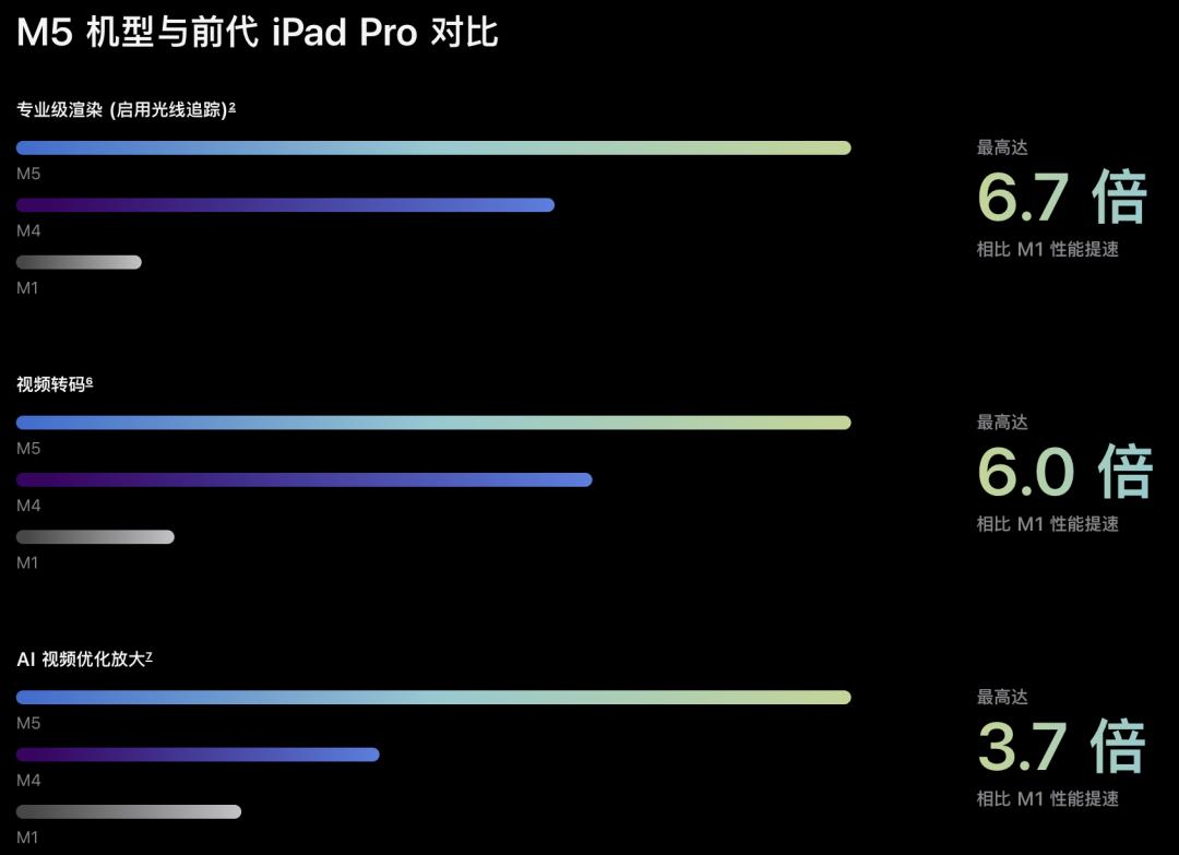 视频转码性能:在Final Cut Pro for iPad中,相较M1快6倍,相较M4提升20%。
