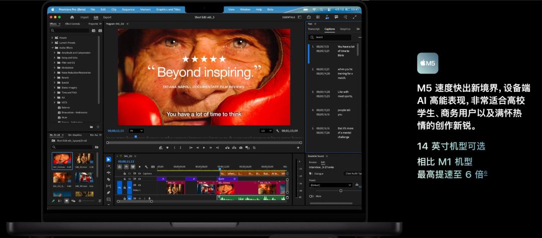 AI视频超分辨率:在DaVinci Resolve中,相较M1提升3.7倍,相较M4提升2.3倍。